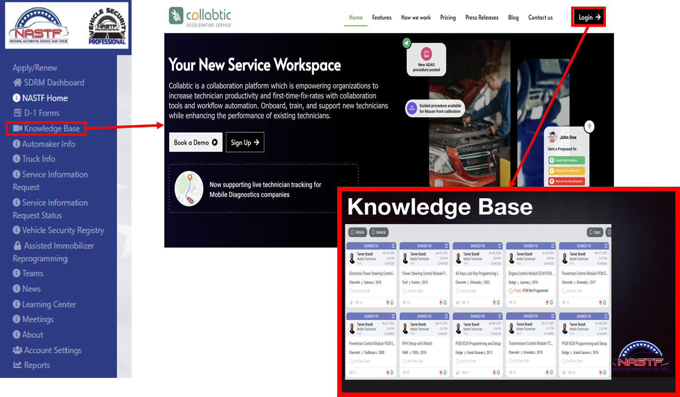 The “Knowledge Base” link in the NASTF menu bar directs users to the Collabtic informational site with videos and documentation outlining the use and process for the SDRM portal along with guides for navigating Automaker sites, technical information and instruction.